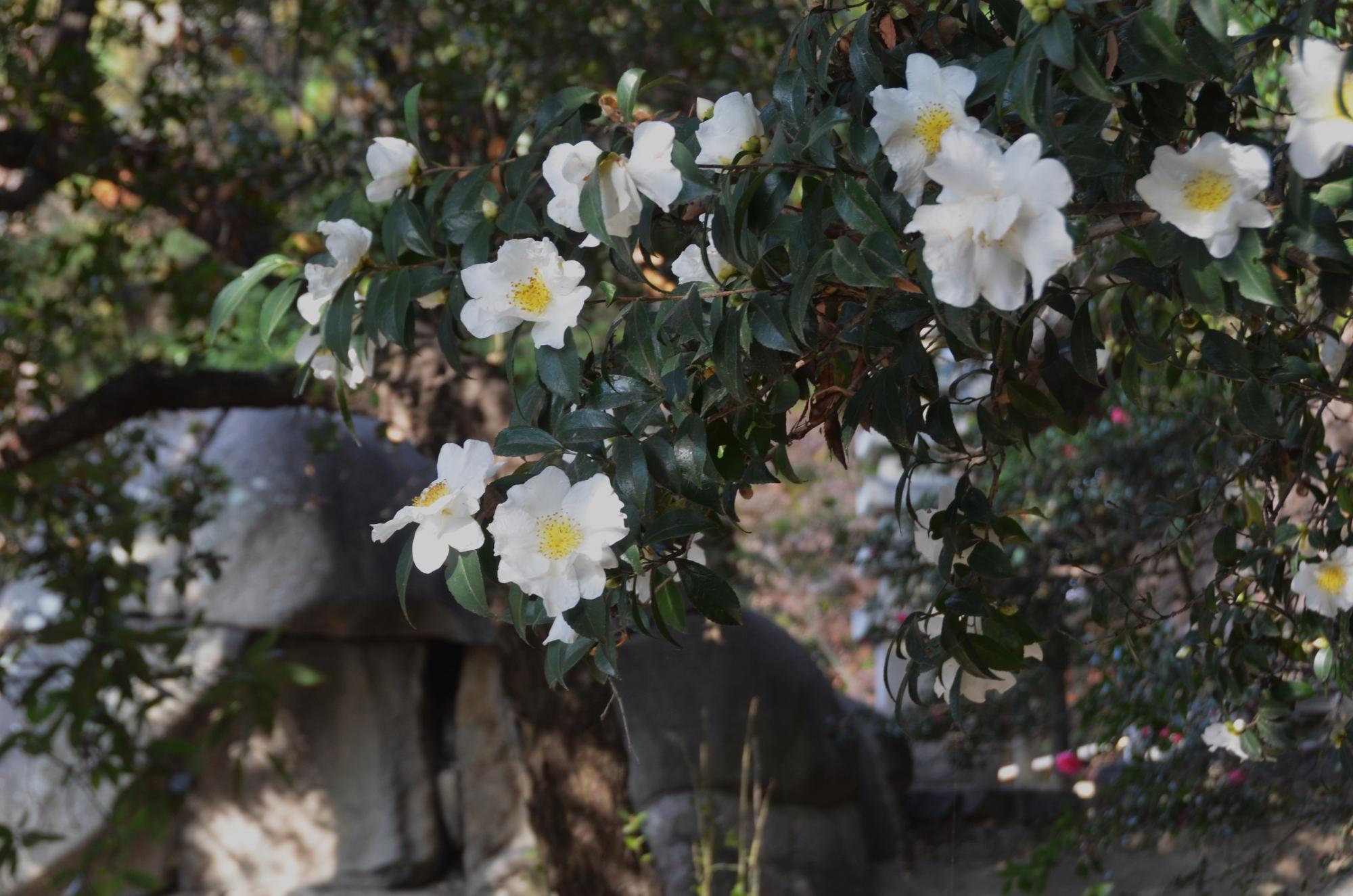 曲水沿いの花々、ピンク色は「ニワウメ」。